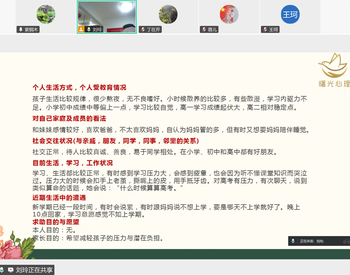 为进一步提升项目咨询师的专业素养与个案处理能力,3月20日晚,“我助妇儿康 莫愁心理关爱工程”项目,在曙光心理举办一场别开生面的个案案例分析培训。本次培训采取“案例讲解+现场优化”线上线下一起互动模式,线上线下共12名咨询师参与学习。