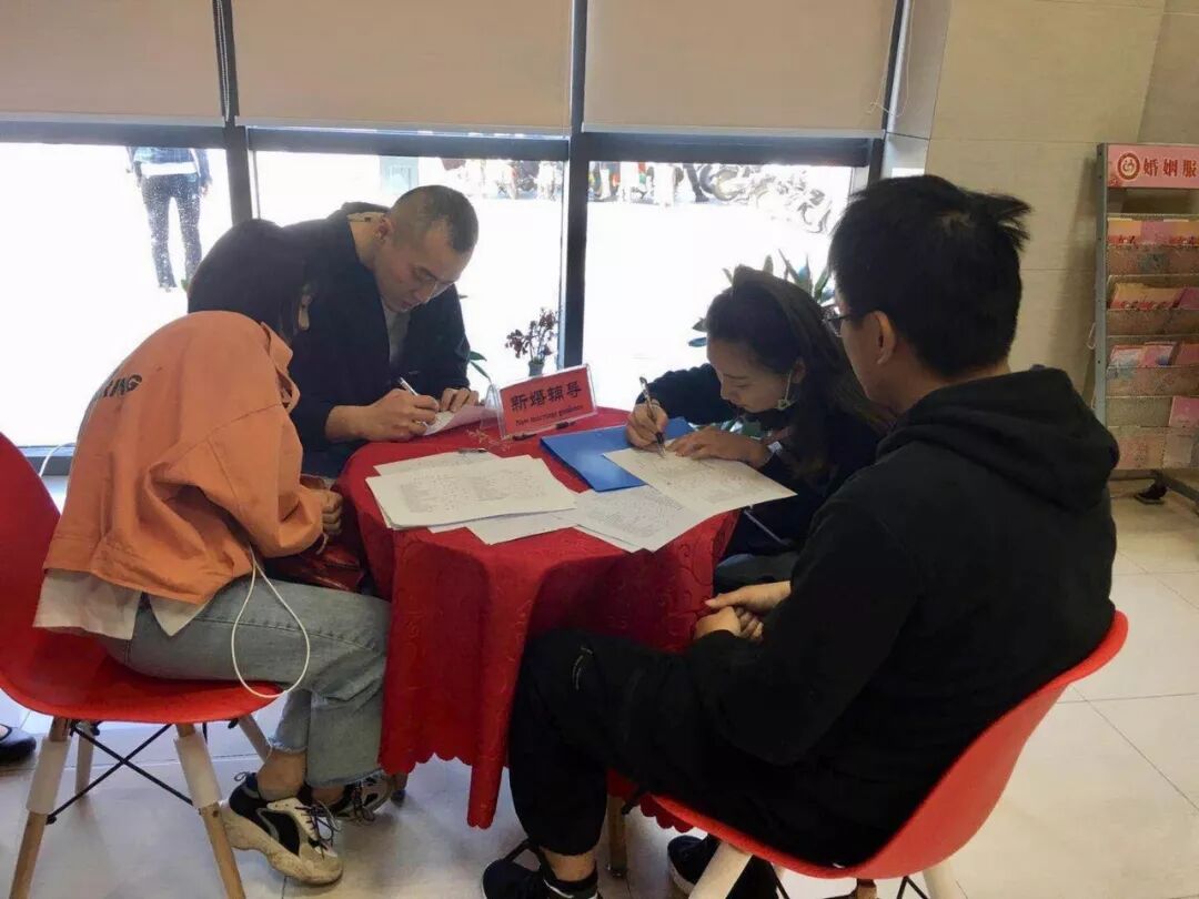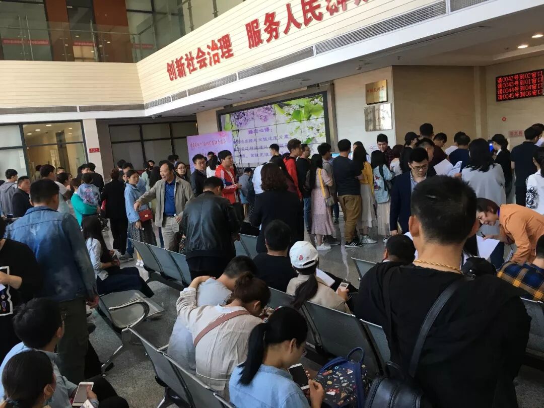 坐得满满的等候区,急切等待叫号的年轻脸庞,写满名字的留言墙,循环播放婚恋心语的LED大屏……
